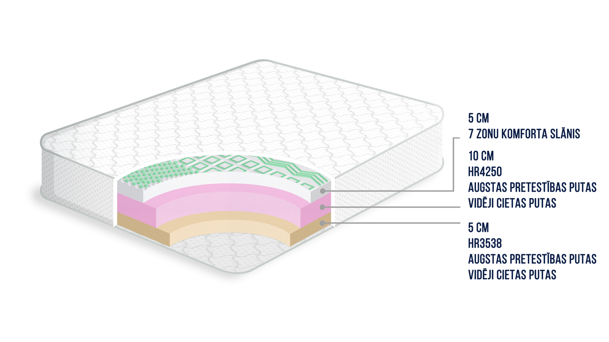7zonu komforta puse lieliski pielāgojas ķermeņa formai, mazinot spriedzi kakla un muguras zonās, tādējādi nodrošinot komfortablu un veselīgu miegu. Šis matracis būs ideāla izvēle tiem, kuriem svarīgs komforts un kvalitatīvs miegs uz mīkstām virsmām un kuri novērtē aktīvu dzīvesveidu. Cietības skalā 2 (vidēji mīksts ar mīkstu virskārtu)
