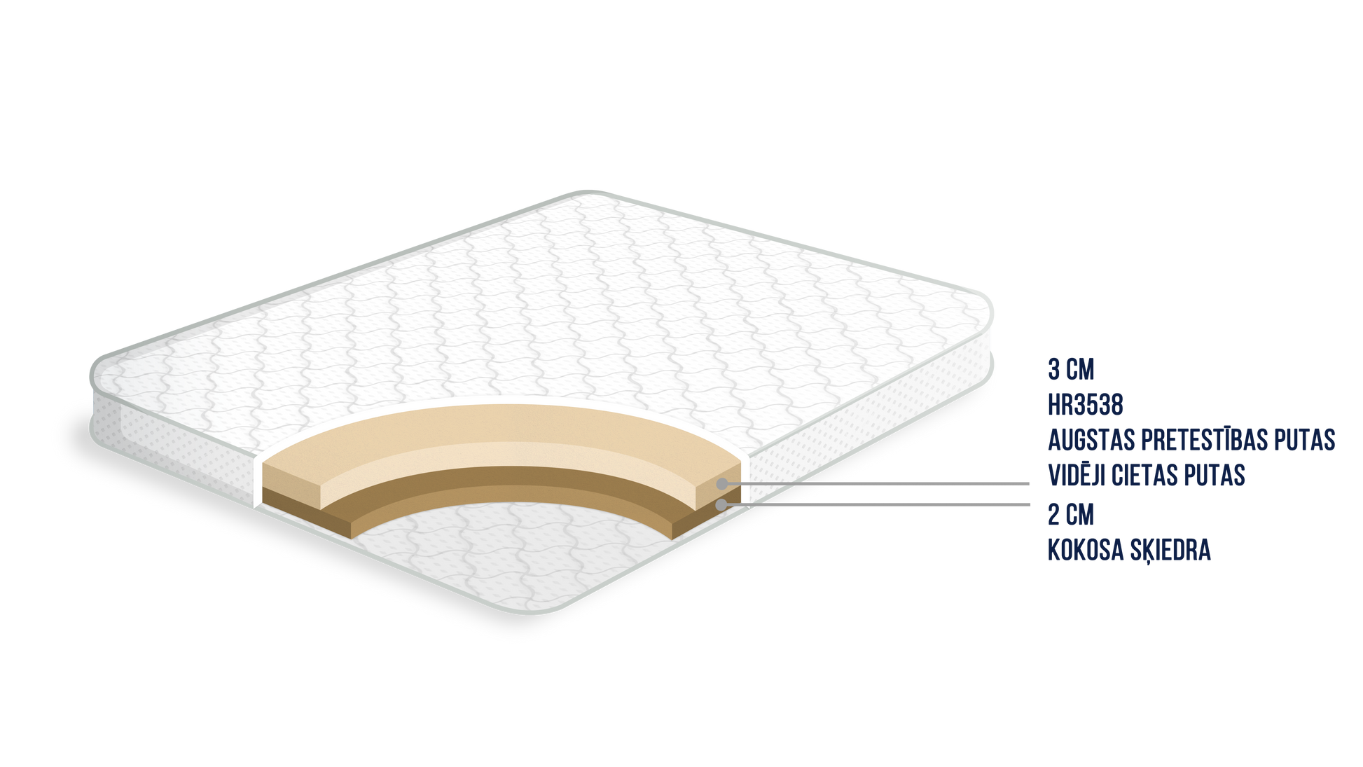 Soft Koko virsmatracis, kas sastāv no divām kārtām - augstas pretestības putas ar vidēju cietumu un kokosa kārta. Matrača viena puse vidēji cieta(4), savukārt otra puse ir vidēja (3) un sastāv no augstas pretestības vidējas cietības putas, .Matracis izmantojams uz abām pusēm.