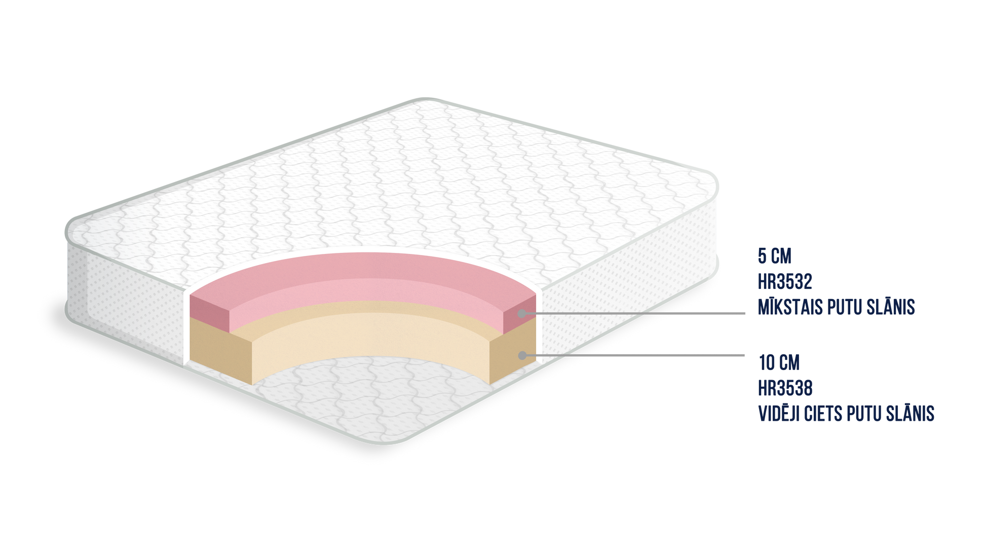 Putu matracis, kas sastāv no diviem putu veidiem. Matracis no vienas puses vidēji mīksts(2), no otras puses vidējas cietības(3).